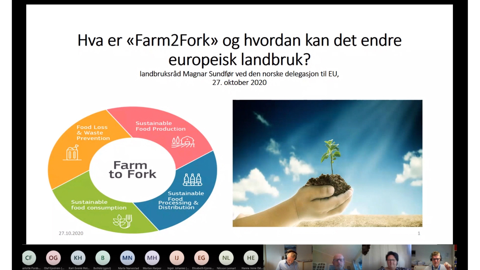 Magnar Sundfør, Norges landbruksråd i Brussel, tok for seg hovedpunktene i Farm to Fork og hvordan strategien kan endre europeisk landbruk. Sundfør påpekte at strategien må sees i sammenheng med både biodiversitetsstrategien, som ble lagt frem samtidig i mai, og EUs «European Green Deal». Farm to Fork har en rekke målsetninger, men er ikke forpliktende politikk ennå. EUs nye landbrukspolitikk skal iverksettes fra 1. januar 2023.