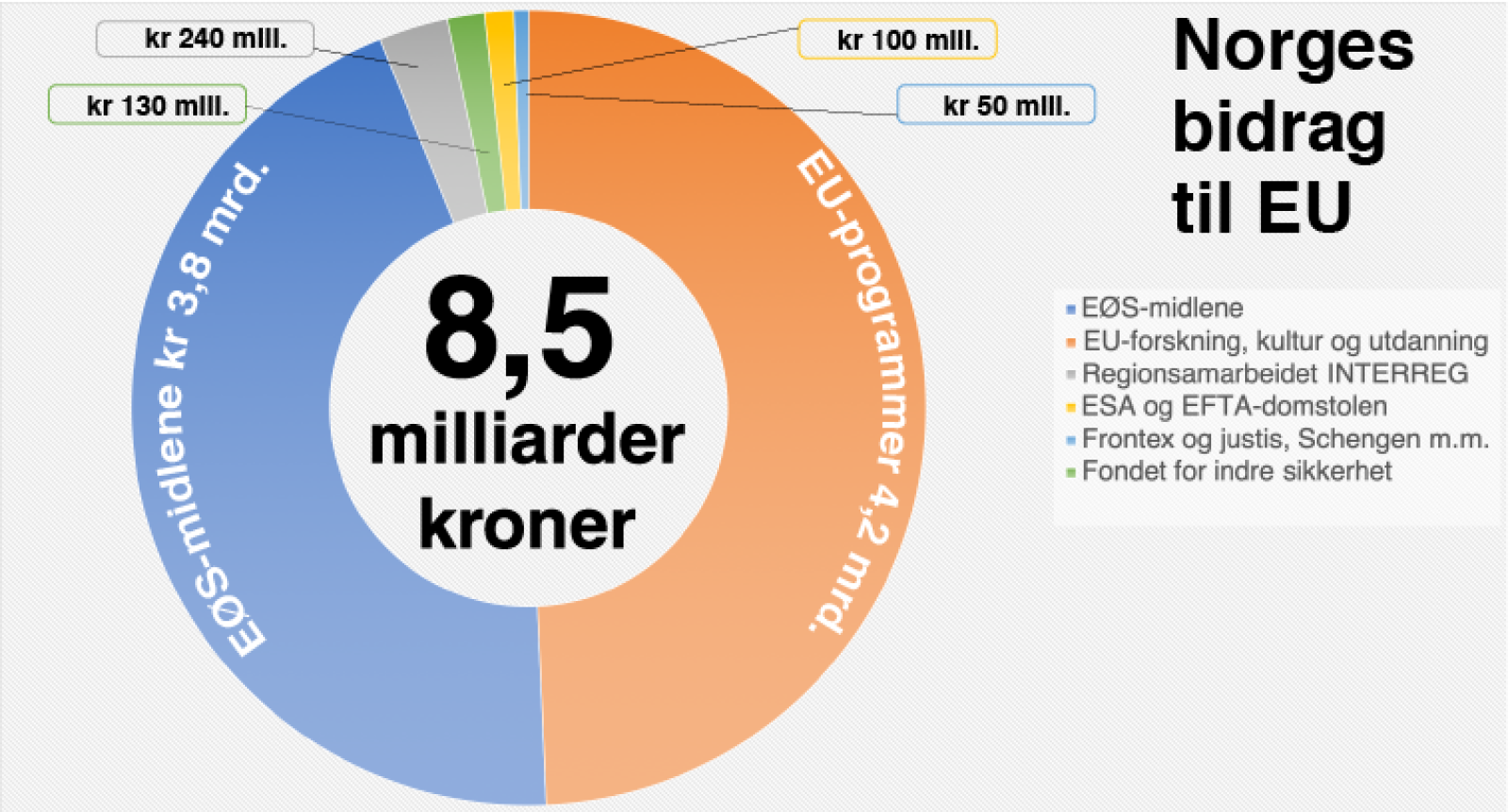 Den største utgiftsposten er EØS-midlene, som skal gå til ulike utviklingstiltak i Øst-Europa. I tillegg kommer en rekke avgifter til forskjellige programmer og EU-byråer. Noen av postene er vanskelige å tallfeste nøyaktig, de kan også variere litt fra år til år.