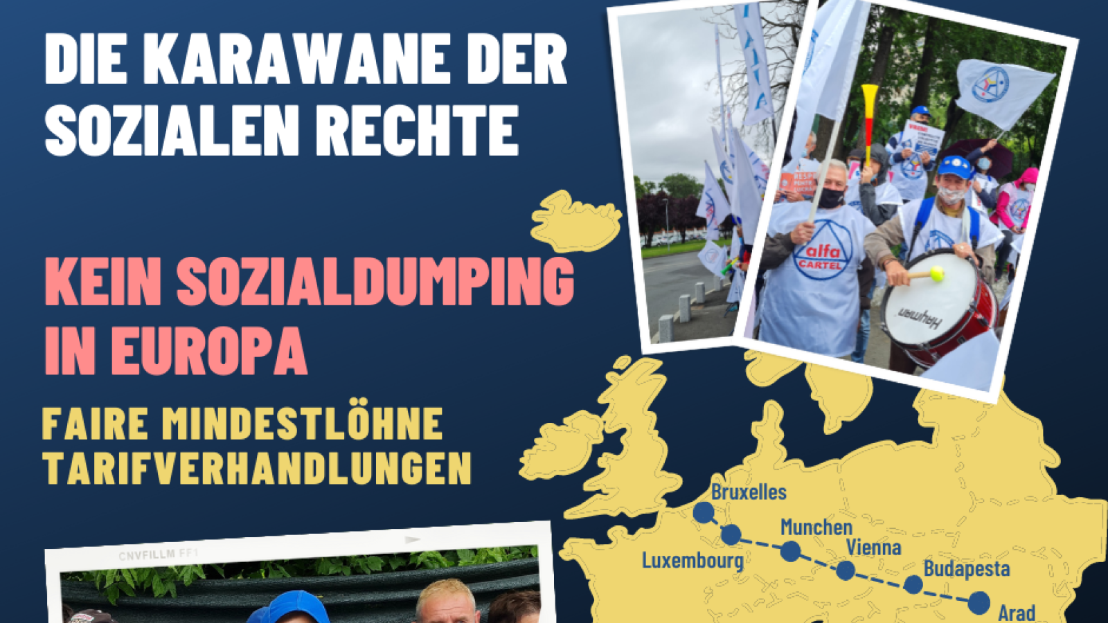 Strekninga mellom de to hovedstedene er 2000 kilometer. Etter stopp underveis i Wien, Budapest og München, endte karavanen opp i Brussel. Her møtte delegasjonen den Europeiske faglige samorganisasjonen (EFS/ETUC) og representanter for EU-kommisjonen.