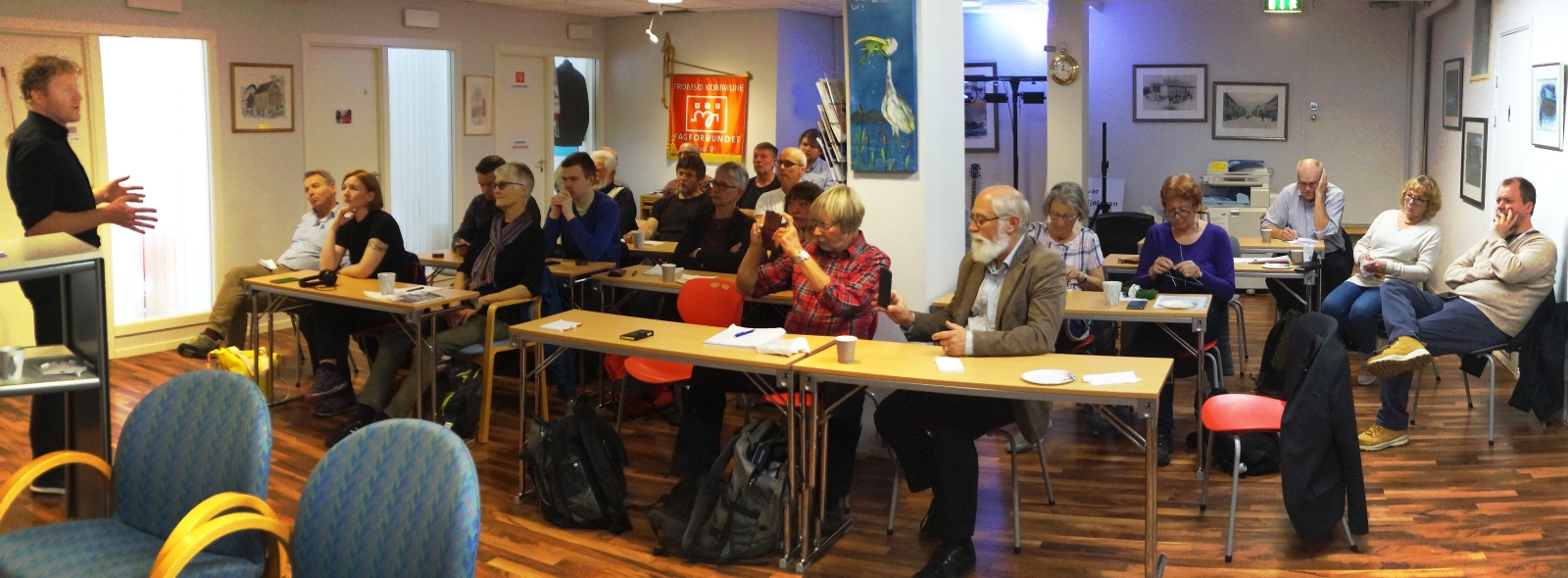 Om lag 25 tilhørere hadde møtt fram for å høre stortingsrepresentant og tidligere Nei til EU-leder Sigbjørn Gjelsvik og utredningsleder i Nei til EU Morten Harper holde foredrag om henholdsvis EØS og Norge etter brexit og EØS og arbeidslivet.