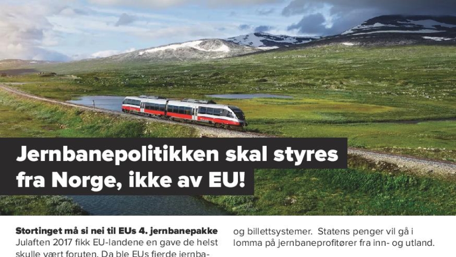 Regjeringen ønsker at Norge slutter seg til EUs Jernbanepakke IV som bl.a innebærer full privatisering av persontrafikken på norsk jernbane. Innføres Jernbanepakke IV i Norge, kan ikke det norske Storting senere reversere politikken. Skal norsk jernbanepolitikk styres fra EU eller det norske Storting?