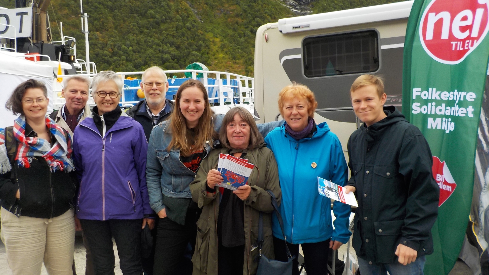 Troms Nei til EU har tradisjon for å ha stand under Husøydagan. Her er gjengen avbildet på standen i messeområdet nede på kaia. Etterpå var det styremøte i fylkeslaget der fiskerikonferansen i Tromsø 28. - 29. september og jubileumskonferansen "Vi stod han av" 16. november var blant sakene.