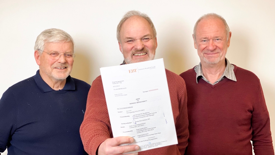 Stort bilde i toppen: Nei til EU-leder Einar Frogner viser fram anken til Høyesterett, flankert av advokatene Kjell Brygfjeld (t.v.) og Bent Endresen (Foto: Eivind Formoe)