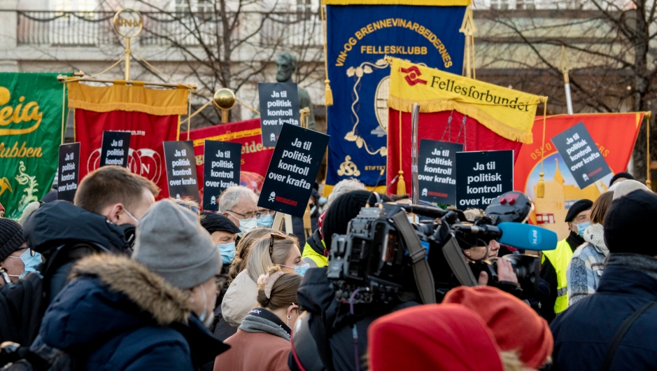 Stort bilde i toppen: Bildet er fra Strømprisalliansens markering for politisk kontroll over strømprisene, foran Stortinget 20. januar 2022. (Foto: Eivind Formoe)