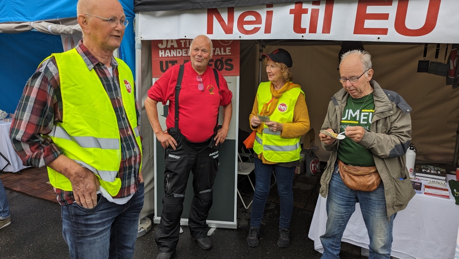 Stort bilde i toppen: Nei til EUs stand under Arendalsuka 2023. Fra venstre Helge Thorbjørnsen, Rolf-Arne Nicolaisen, Ingrid Skårmo og Olaf Bakke. (Foto: Sindre Humberset )